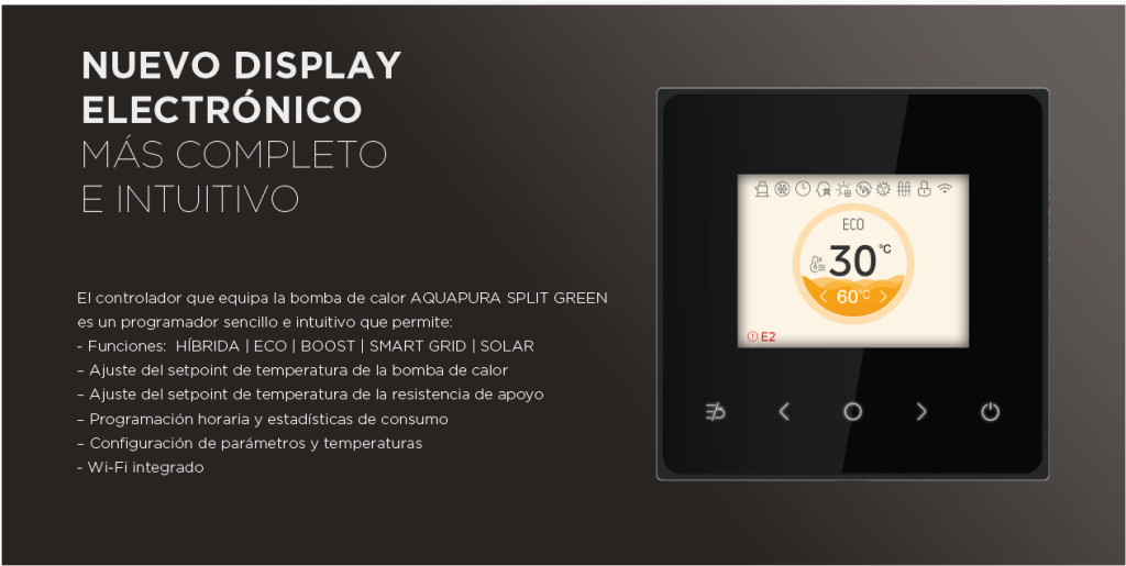 La bomba de calor AQUAPURA SPLIT GREEN es una solución moderna, eficiente y ecológica para la producción de Agua Caliente Sanitaria, ideal tanto para uso doméstico como para aplicaciones de gran consumo, como hoteles, hospitales o gimnasios. Con tecnología de condensación directa, está compuesta por una unidad exterior y un termoacumulador interior, interconectados mediante tubería de hasta 30 metros de longitud total y con un desnivel máximo de 20 metros entre unidades. La bomba de calor AQUAPURA SPLIT GREEN funciona con temperaturas exteriores de hasta -15°C y permite producir Agua Caliente Sanitaria a 65°C únicamente con el compresor, lo que posibilita la sustitución directa de sistemas convencionales como calentadores a gas o termos eléctricos.