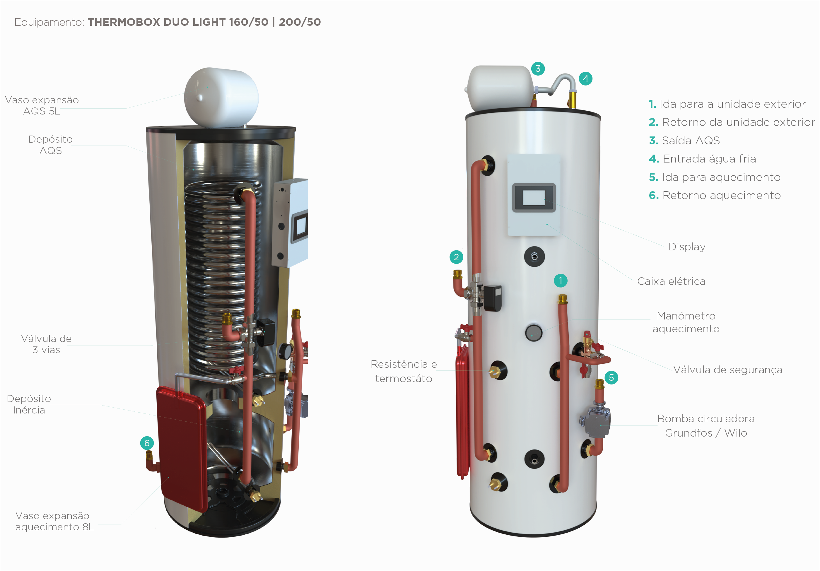 A THERMOBOX DUO LIGHT é uma unidade interior para Bomba de Calor, pensada para economizar tempo e espaço, evitando problemas ou erros de instalação. Composta por um acumulador de Água Quente Sanitária (AQS) e um acumulador de inércia que pode ligar à sua Bomba de Calor. Inclui a grande maioria dos acessórios necessários, tornando-se uma solução Plug and Play, reduzindo tempo e custos de instalação, ao mesmo tempo que melhora a eficiência energética da sua casa.